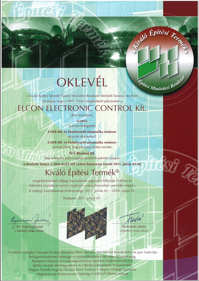 Az Elcon Electronic Kft. által gyártott E- HFR Hő- és füstelvezető automatika rendszer a jogszabályok által meghatározott kötelező teljesítményei, tanúsítványai és a gyártó által önként vállalt többletteljesítményei alapján 2015.06.03-án elnyerte a Kiváló Építési Termék® minősítést és a tanúsító védjegy használati jogát.